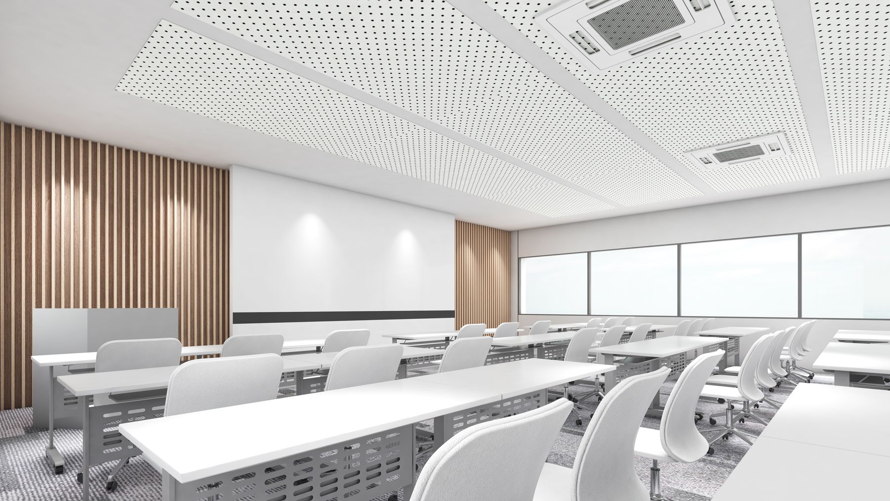 On intervient sur plafonds et murs en traitant ce qui pèse le plus sur l’acoustique : surfaces dominantes, zones d’échange, zones d’écoute et circulation.